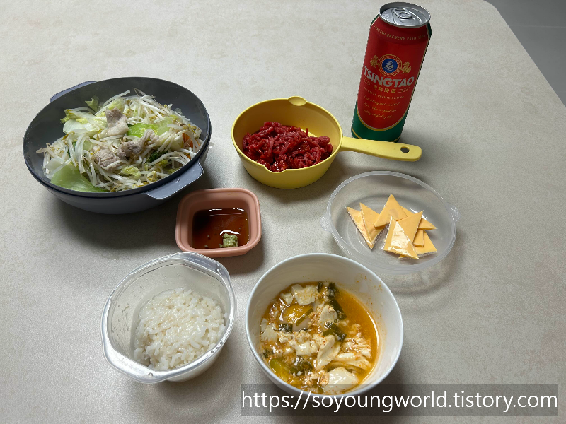 육회에 우삼겹야채찜에 순두부찌개에 맥주한캔까지